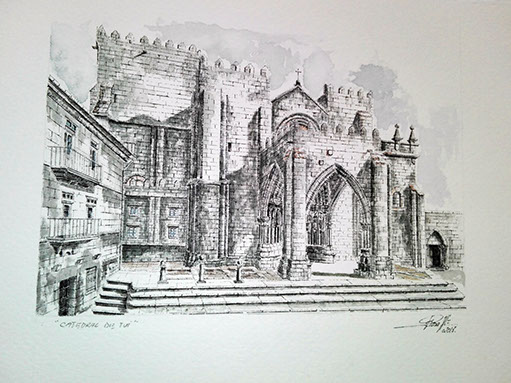 Decidí usar en esta composición la plumilla negra , aclarando y dando luz con una aguada en acuarela...sus grandes volúmenes hacen una gran armonía para utilizar el clarooscuro.